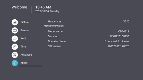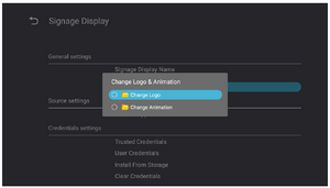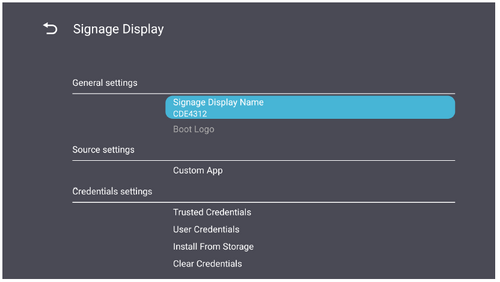 | General Settings | Signage Display Name Setup the display’s name. Maximum of 36 characters. Boot Logo
