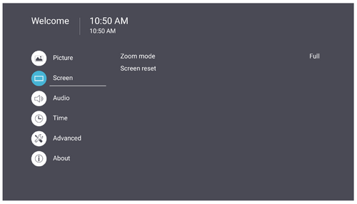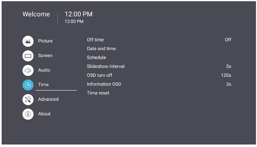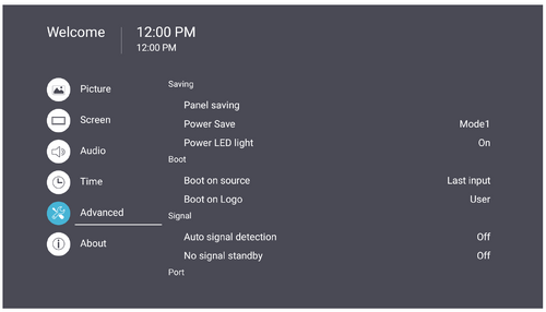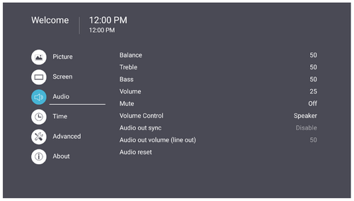 Access Picture, Screen, Audio, Time, Advanced, and About settings.
