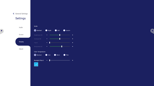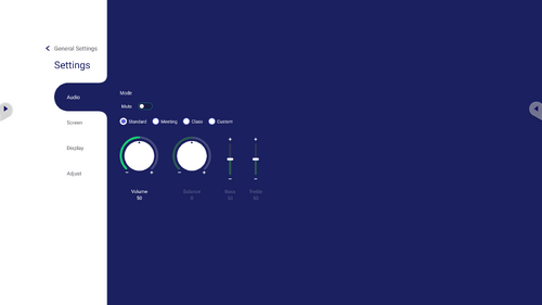 Press MENU on the remote control or select the setting icon next to the input source in Input Settings to launch the Settings menu. Settings include: Audio, Screen, Display, and Adjust.