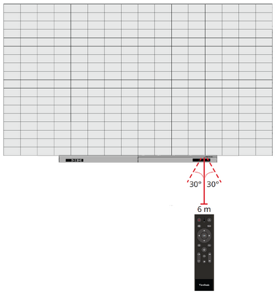 The operating range of the remote control is shown here. It has an effective range of 6 meters (20 feet), 30° degrees left and right. Please make sure there is nothing obstructing the remote control’s signal to the receiver.
