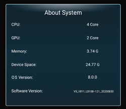 | About System | View system information such as: CPU core count, GPU core count, Memory used, Storage Space remaining, OS version, and Software version. |