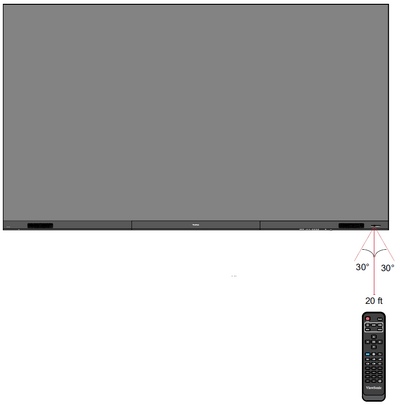 The operating range of the remote control is shown here. It has an effective range of 20 feet (6 meters), 30° degrees left and right. Ensure there is nothing obstructing the remote control’s signal to the receiver.