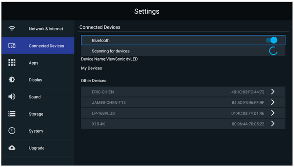 Enable/disable device connection, review connected devices, and search and connect to other devices.