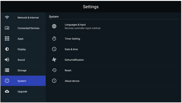 | System | View and adjust Languages & Input, Date & Time, Dehumidification, Reset, and About Device. |