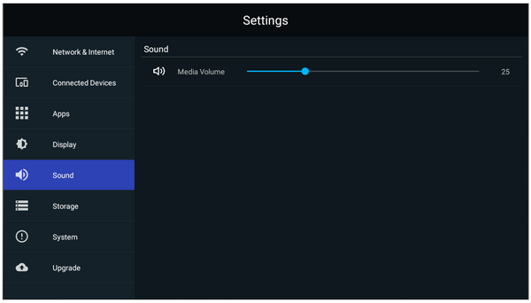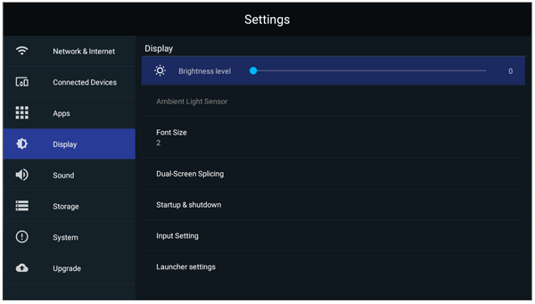| Display | View and adjust Brightness Level, Ambient Light Sensor, Font Size, Startup & Shutdown, Input Setting, and Launcher Settings. |