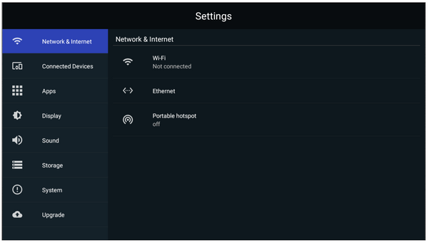 | Network & Internet | View and adjust Wi-Fi, Ethernet, and Potable Hotspot. |