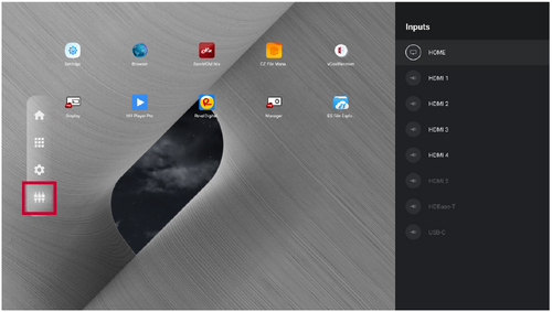 The display supports eight input sources: Home, HDMI 1,HDMI 2, HDMI 3, HDMI 4, HDMI 5, HDBaseT, and USB C.