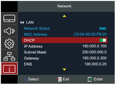 - Open the On-Screen Display Menu and go to: Network > LAN.