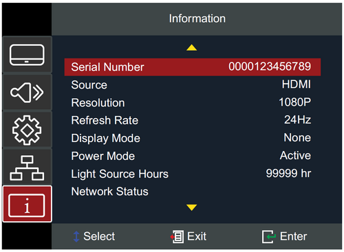 View Serial Number, Source, Resolution, Refresh Rate, Display Mode, Power Mode, Light Source Hours, Network Status, IP Address, Brightness Mode, and Firmware Version information.