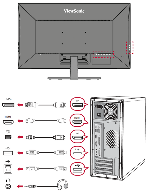 - Connect one end of a DisplayPort cable to the DisplayPort Out port of your computer. Then connect the other end of the cable to the DisplayPort In port of the monitor.