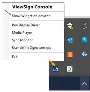 After ViewSign Console is installed and the ViewSonic Pen Display Device is connected, a ViewSign Console Widget will be present on the computer’s desktop and tray icon as shown above.