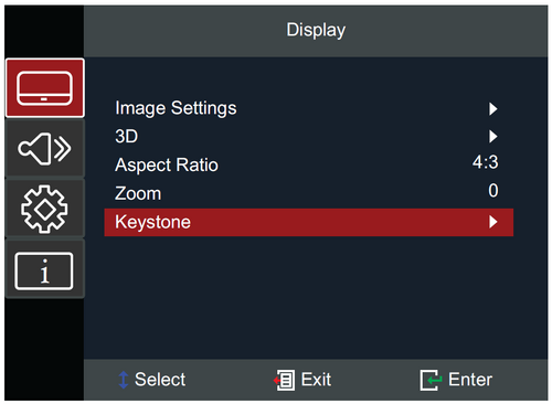 - NOTE: While adjusting the Four Corners, the Aspect Ratio, Edge Mask, Image Shift, and Zoom menus will be disabled. To enable them, reset the Keystone settings to default.