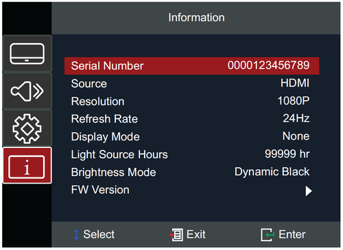 View Serial Number, Source, Resolution, Refresh Rate, Display Mode, Light Source Hours, Brightness Mode, and Firmware Version information.